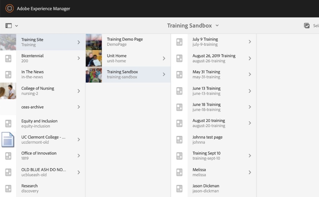 The other main section users will need to navigate is the "home/uc" node. Any site that starts with uc.edu/sitename can be found under this node.