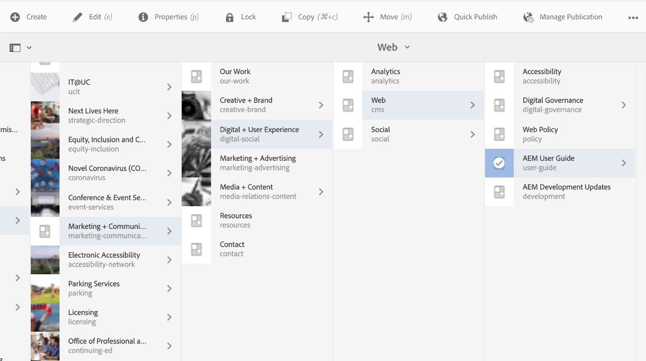 - News - All stories for UC News are created and submitted through AEM. Separate access and training is required for access to the news system.