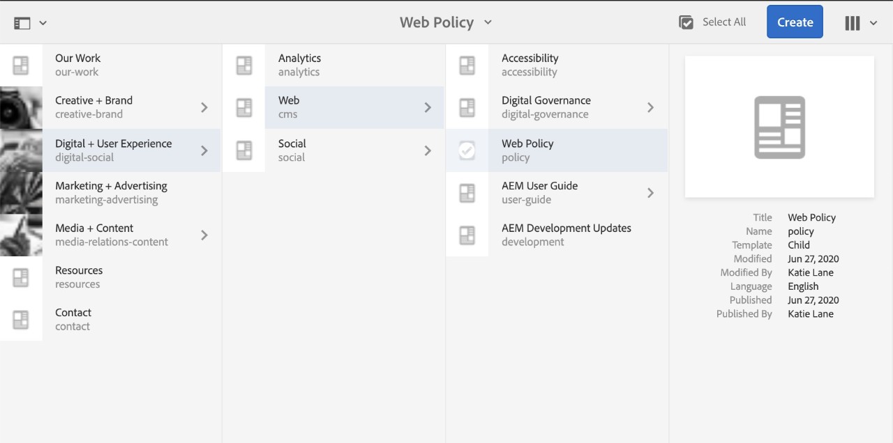 The column view is best suited for desktop editing and allows for a visual navigation of a pages through a series of cascading columns. Selecting a page in the leftmost column will display the child pages in a column to the right. Selecting a page in the right column will then display the child pages in another column to the right and so on.